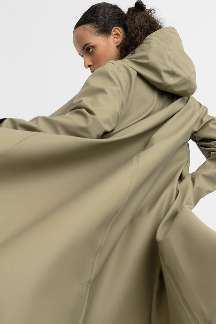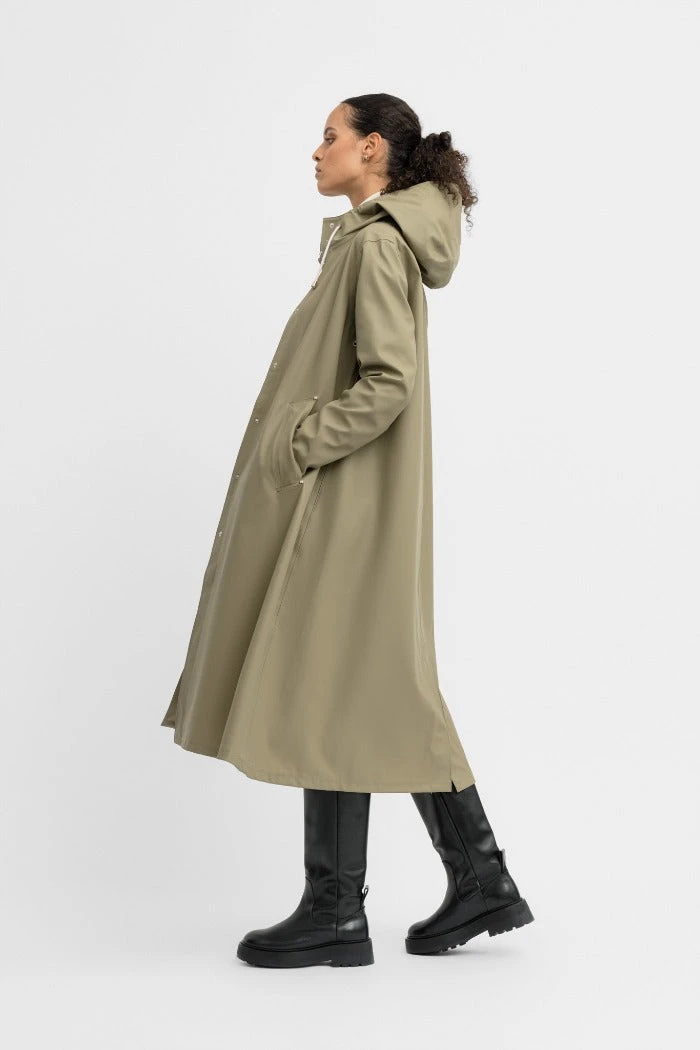 Stutterheim Mosebacke long raincoat in green aloe is the a flowing A-line women’s raincoat combining flair with all-weather protection in long cut. Mosebacke is the ladies’ specific complement to our unisex Stockholm raincoat. It combines the best of Stutterheim’s Scandinavian design sensibilities and wet-weather protection with a flowing, feminine silhouette. It is handmade in rubberized cotton, comes unlined and with welded seams. The finest craftsmanship is used to create this beautiful raincoat, here in aloe with silver buttons, white cotton lining and hemp strings. See other colors in the Mosebacke here! Check out the straight Stockholm style here. Mosebacke