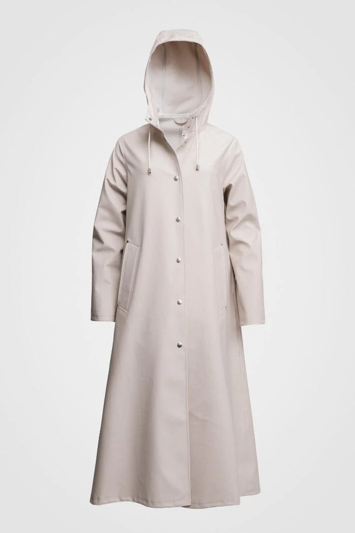 Stutterheim Mosebacke long raincoat in light sand is the a flowing A-line women’s raincoat combining flair with all-weather protection in a slightly long cut. Mosebacke is the ladies’ specific complement to our unisex Stockholm raincoat. It combines the best of Stutterheim’s Scandinavian design sensibilities and wet-weather protection with a flowing, feminine silhouette. It is handmade in rubberized cotton, comes unlined and with welded seams. The finest craftsmanship is used to create this beautiful raincoat, here in light sand with silver buttons, white cotton lining and hemp strings. See other colors in the Mosebacke here! Check out the straight Stockholm style here. Mosebacke