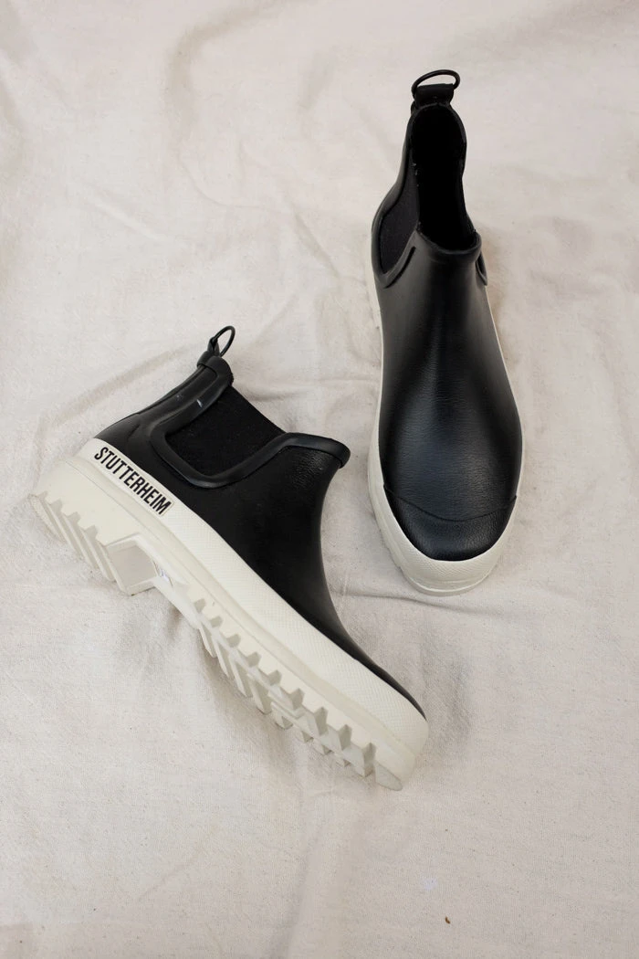 Stutterheim Chelsea rain walker rain boots in black with contrasting ivory soles. These boots are waterproof. soft and flexible, conforming to the wearer’s feet over time.