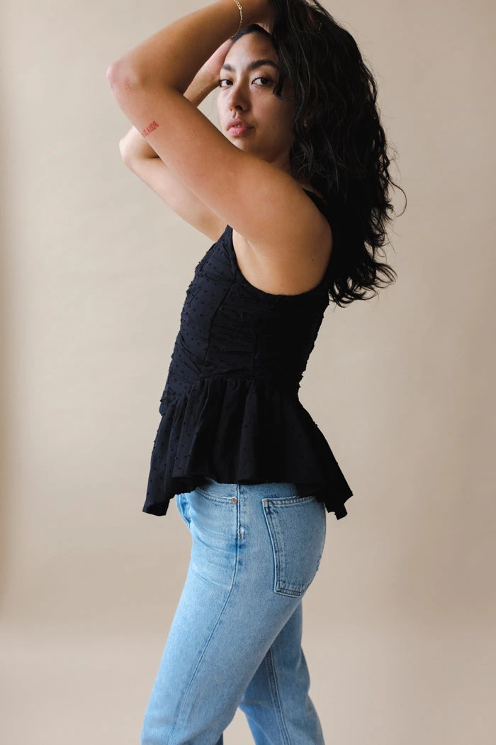 Tach Carmina textured voile drapped black corset top. Zipper at the back.