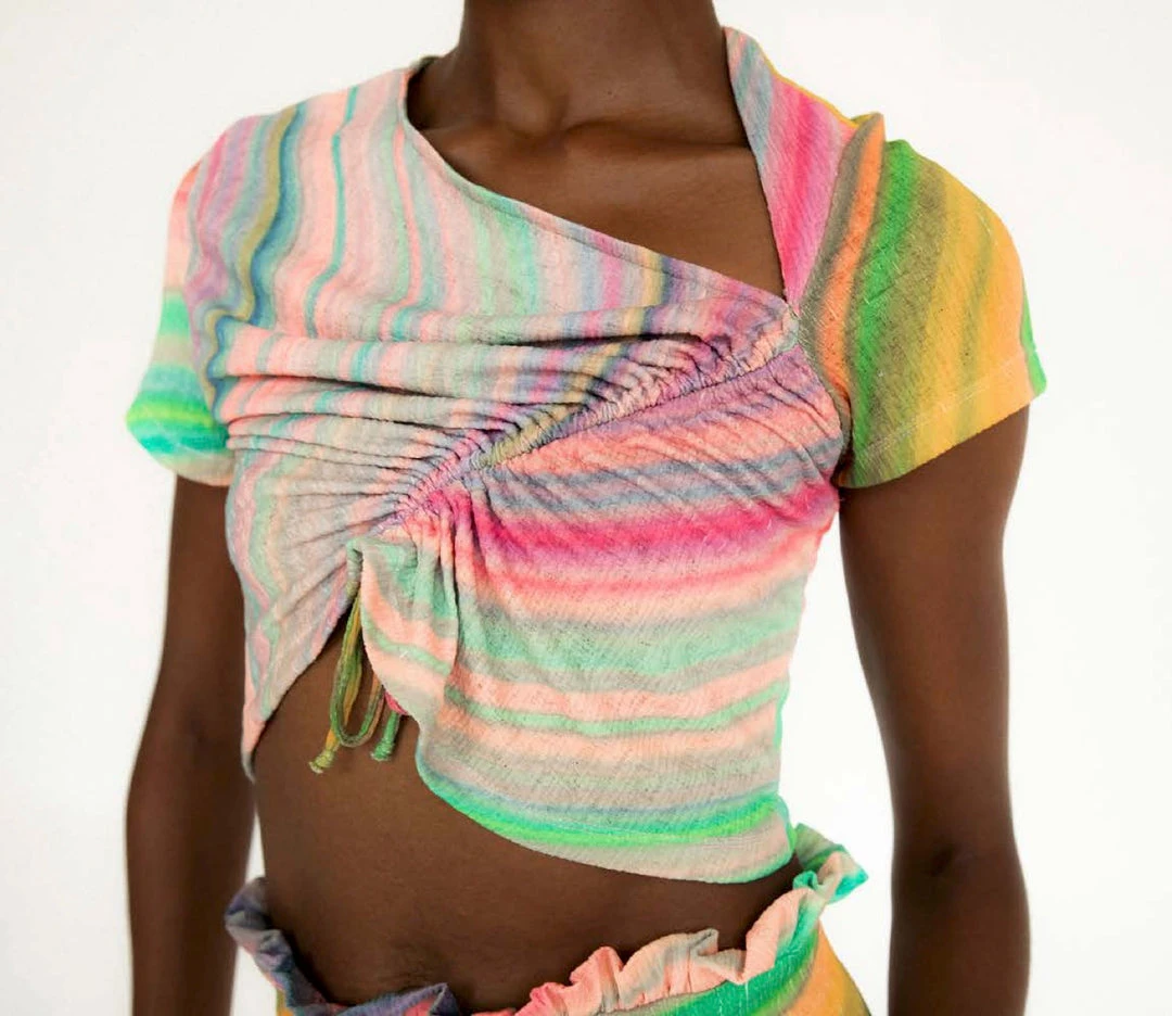 Tach Clarissa multi colored, textured, printed, adjustable top. Irregular neckline, drapped at the front. Short sleeves. Fabric is stretchy.