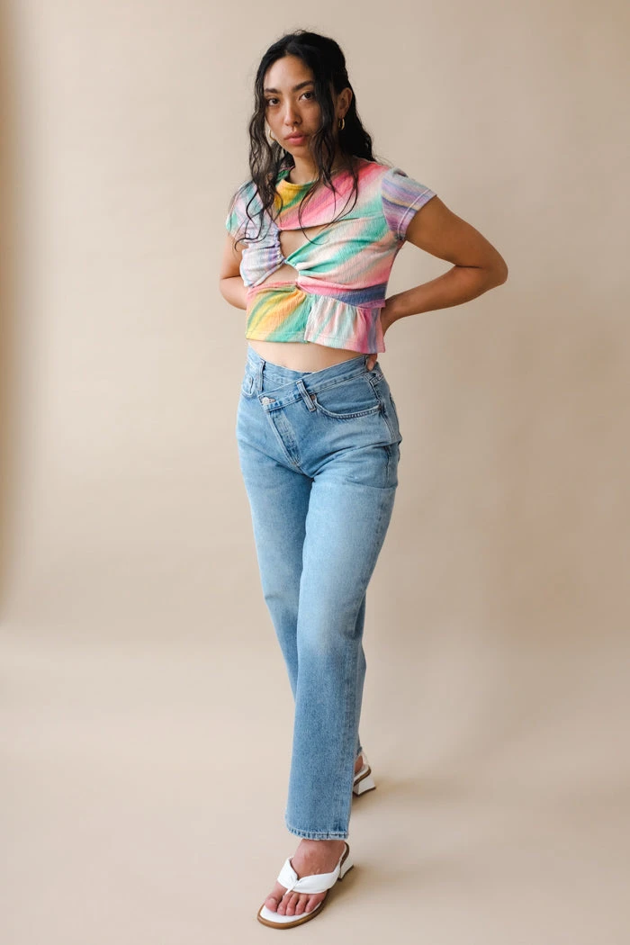 Tach Electra cut out, short sleeve, multi colored printed, textured top. Fabric is stretchy.