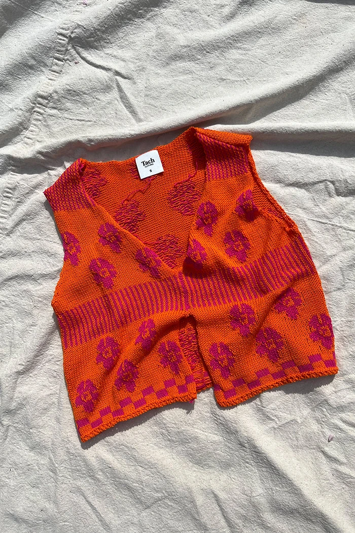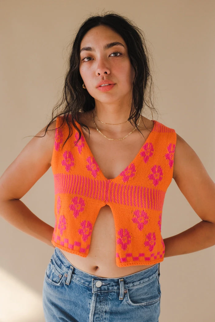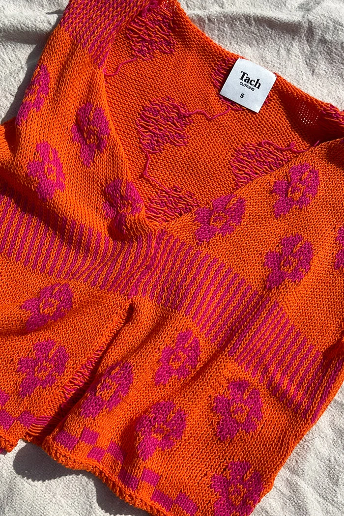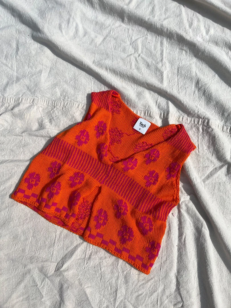 Tach Loreza knit tank top in orange and pink magenta jaquard floral.