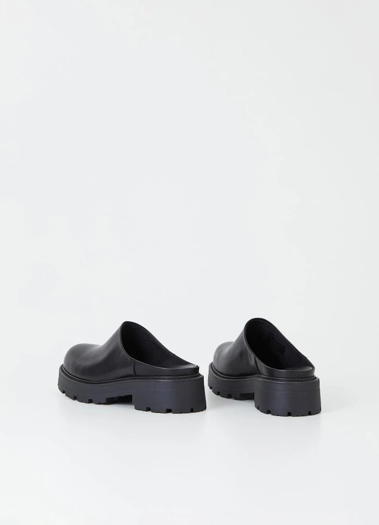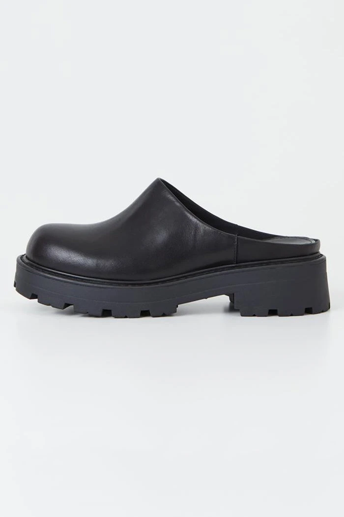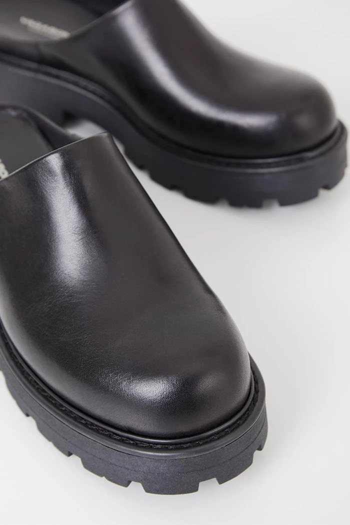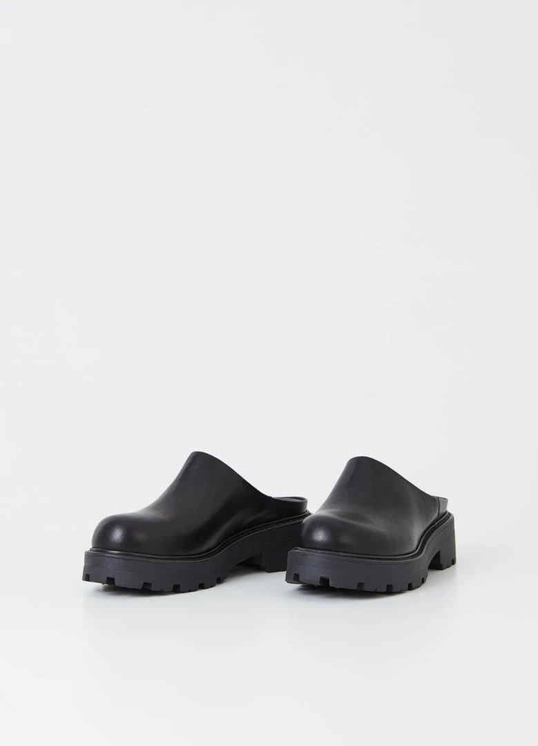 Vagabond chunky mule Cosmo 2.0 clog in black leather. A slip-in design, rounded toes and a minimal upper.