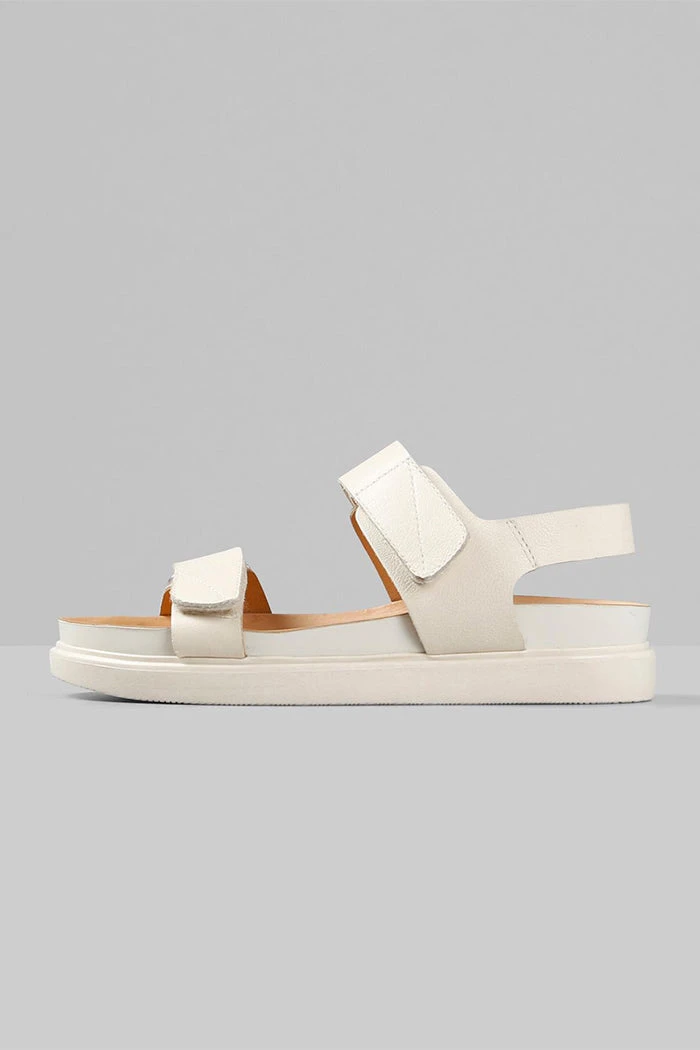 Vagabond Erin two strap leather sandal in off white . Hanging by the pool or exploring the city – new sandal Erin has endless styling possibilities. The minimalist upper with velcro straps, crafted from black leather is combined with a chunky outsole for immediate urban style impact.