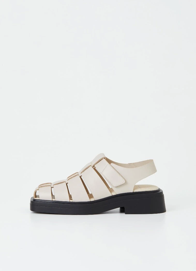 Vagabond Eyra fisherman sandal in off white smooth leather. Featuring a woven design, adjustable ankle straps and boxy square toes. The contrast-colored rubber outsoles measure 45mm.
