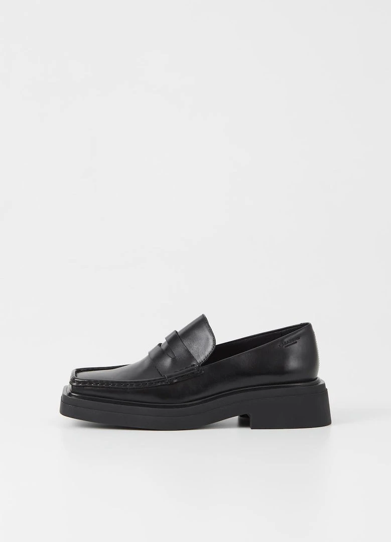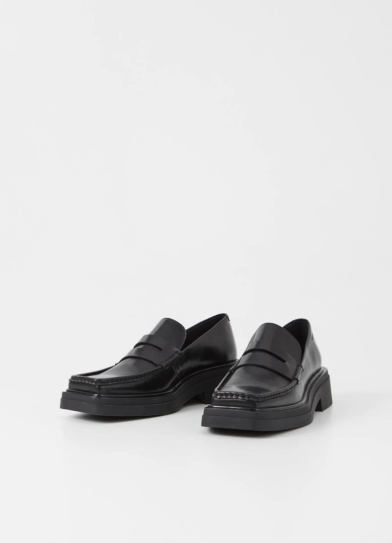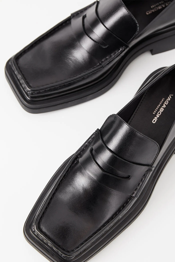 Vagabond Eyra polished black leather, square toe, penny loafers. The transeasonal piece that will elevate your loafer-edit this season. The solid outsoles and sharp squared toes provides a contemporary edge suitable for any occasion.