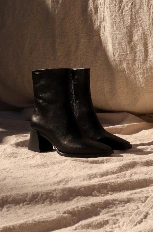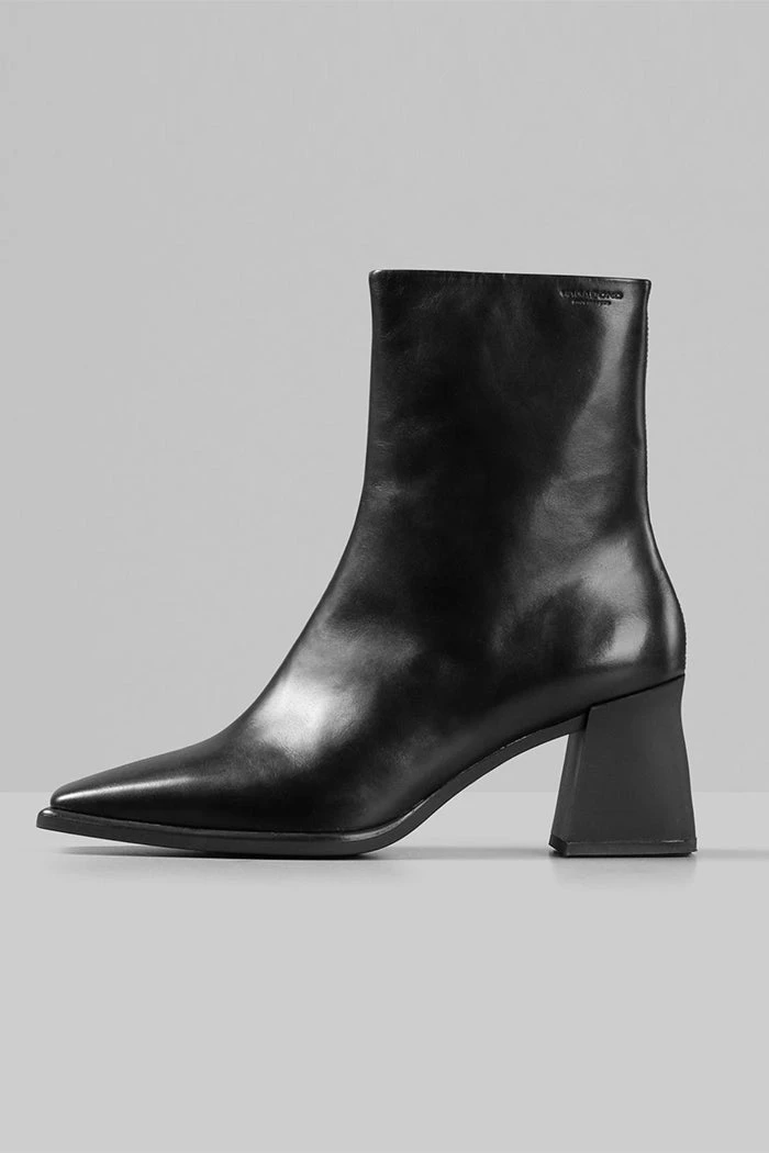 Vagabond Hedda mid-high boots has a retro aesthetic to it with its curved block heels and flat square toes. The upper is crafted from smooth black leather featuring a squared-toe finish and angled high heels. Zipped inside for easy wear and removal.