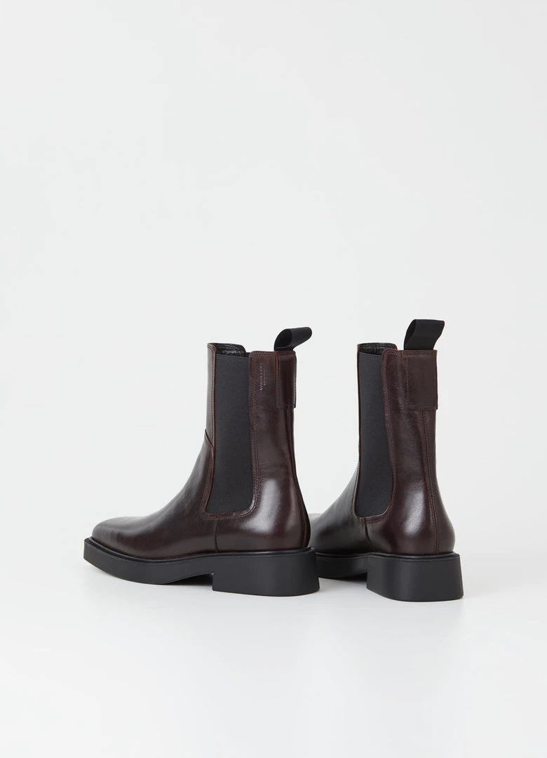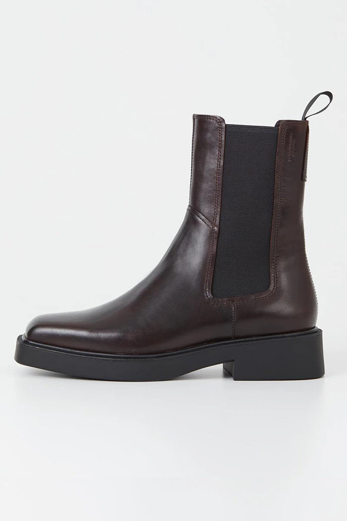 Vagabond Jillian java dark brown leather square toed boots. Jillian brings a modern take on classic chelsea boots. Crafted in brown leather, the mid-high shaft has elastic side panels for great wearability. The squared toe and solid outsoles brings a contemporary look in line with this season’s heavyset silhouettes. Other details include decorative upper seams and pull-on tabs.