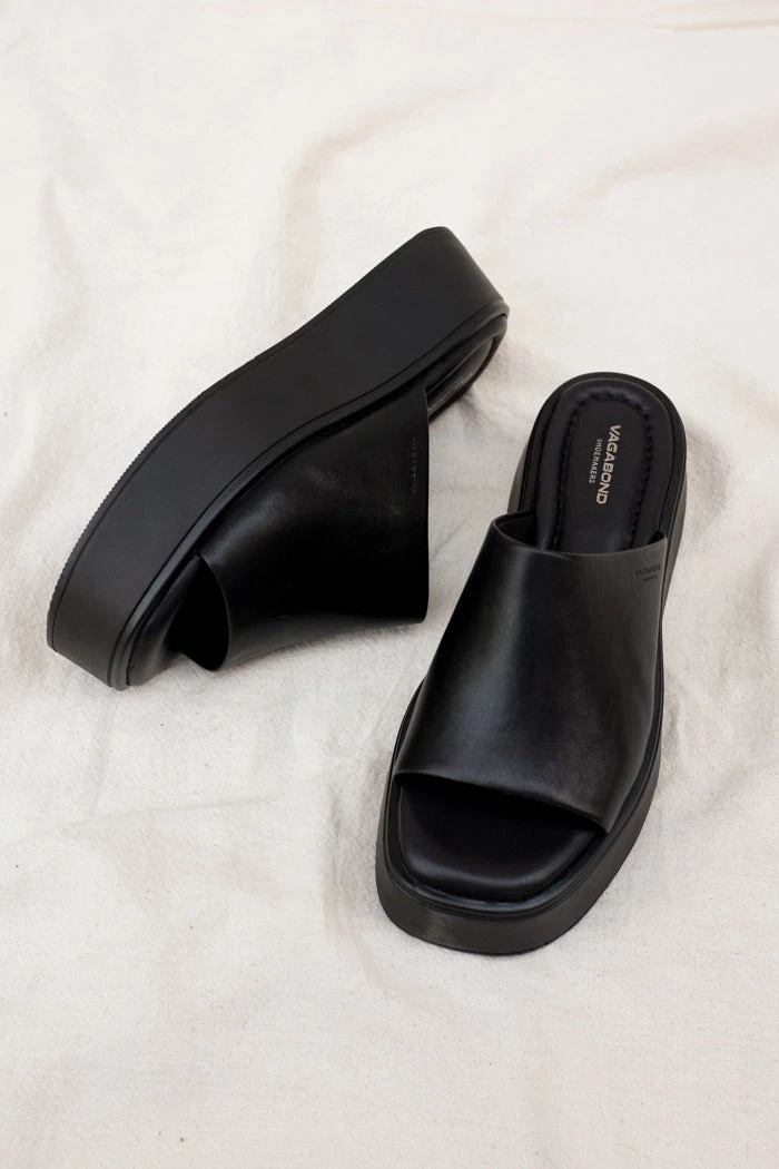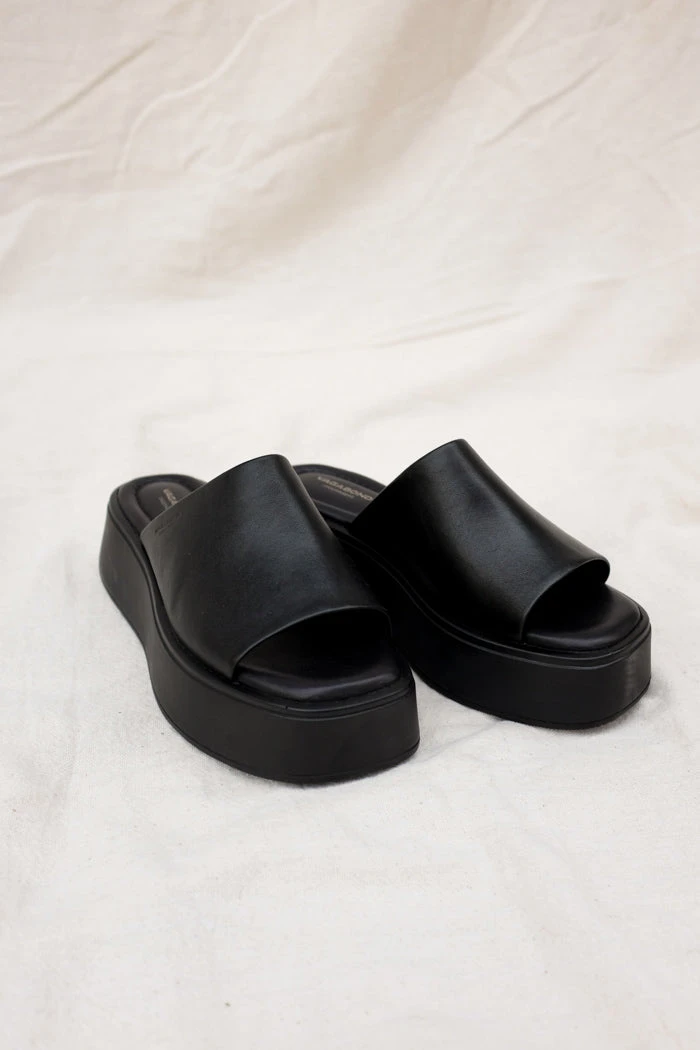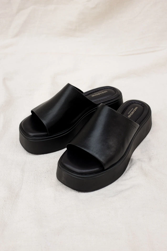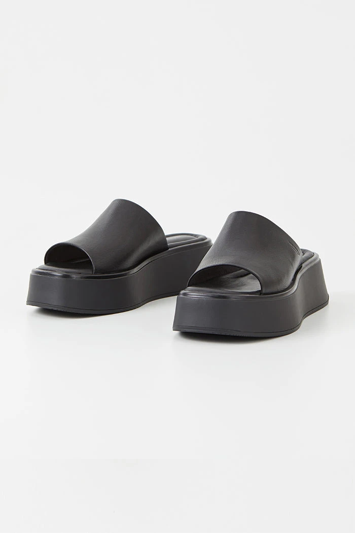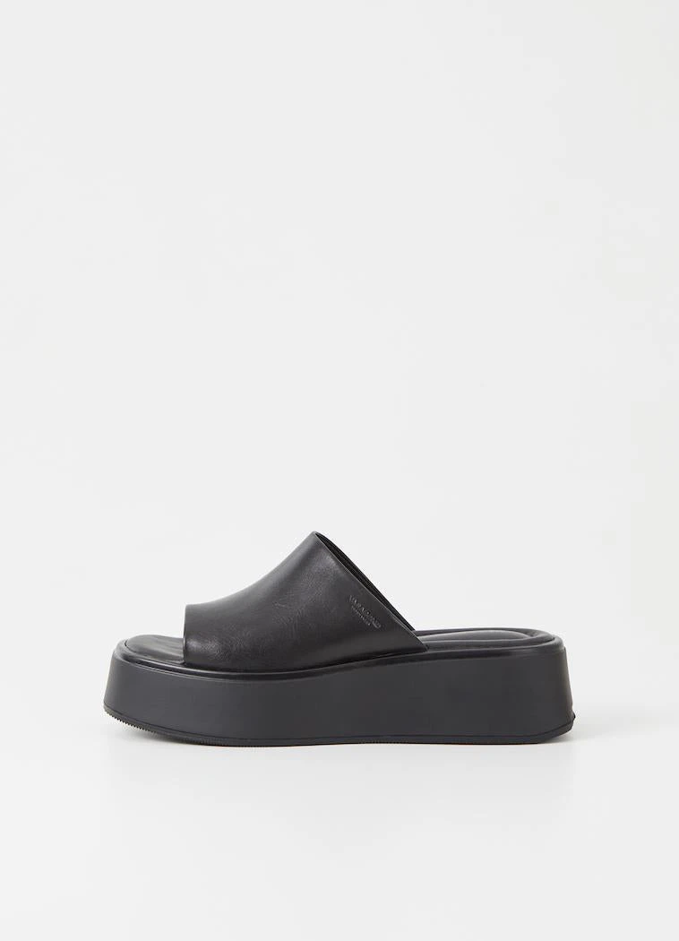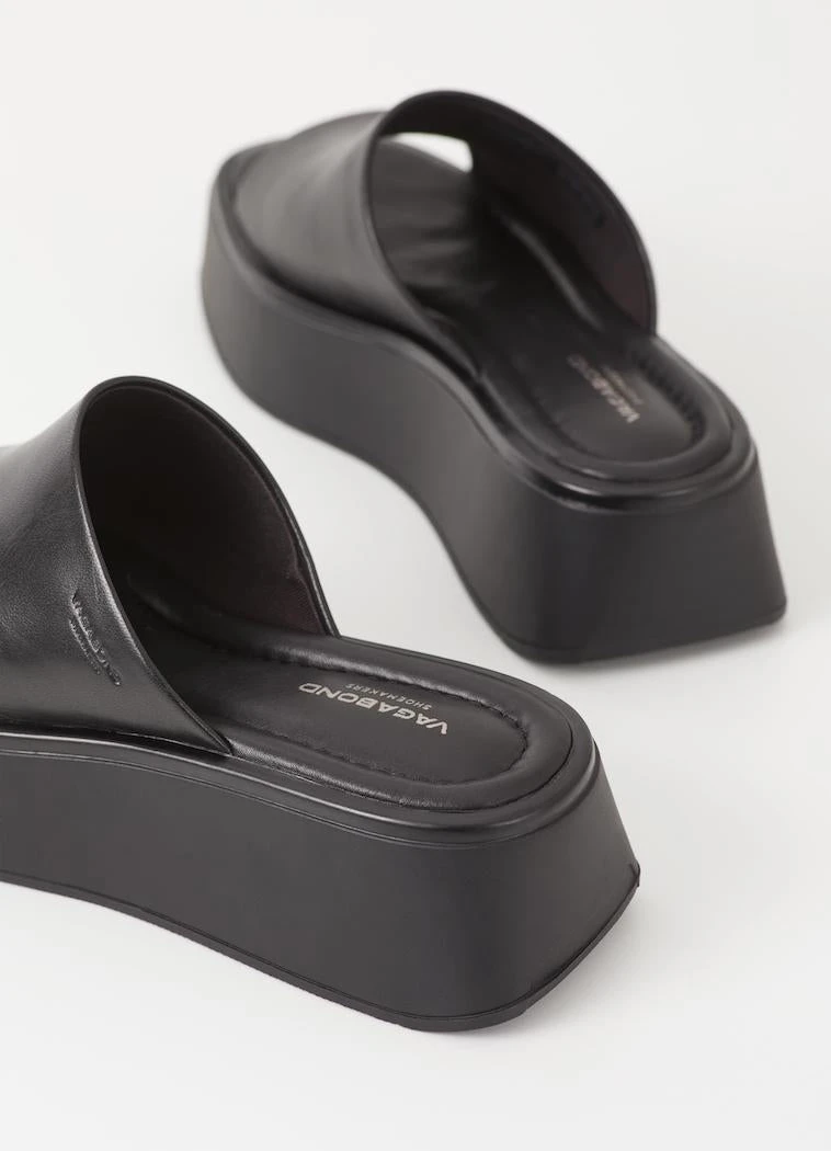 Vagabond Shoemakers Courtney platform slides. It is all about the characteristic flared outsole that makes this pool slide style the ultimate sandal of the season. The simple slip-on upper, made from black leather, is grounded by tonal flatform soles measuring 50 mm. Details include padded insoles and square toes.