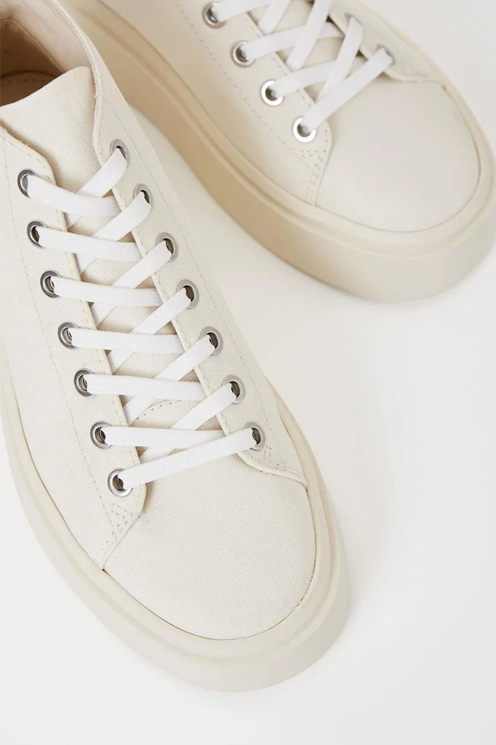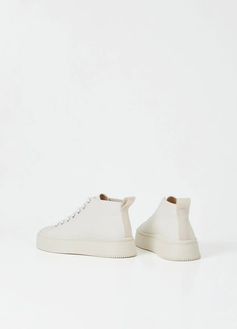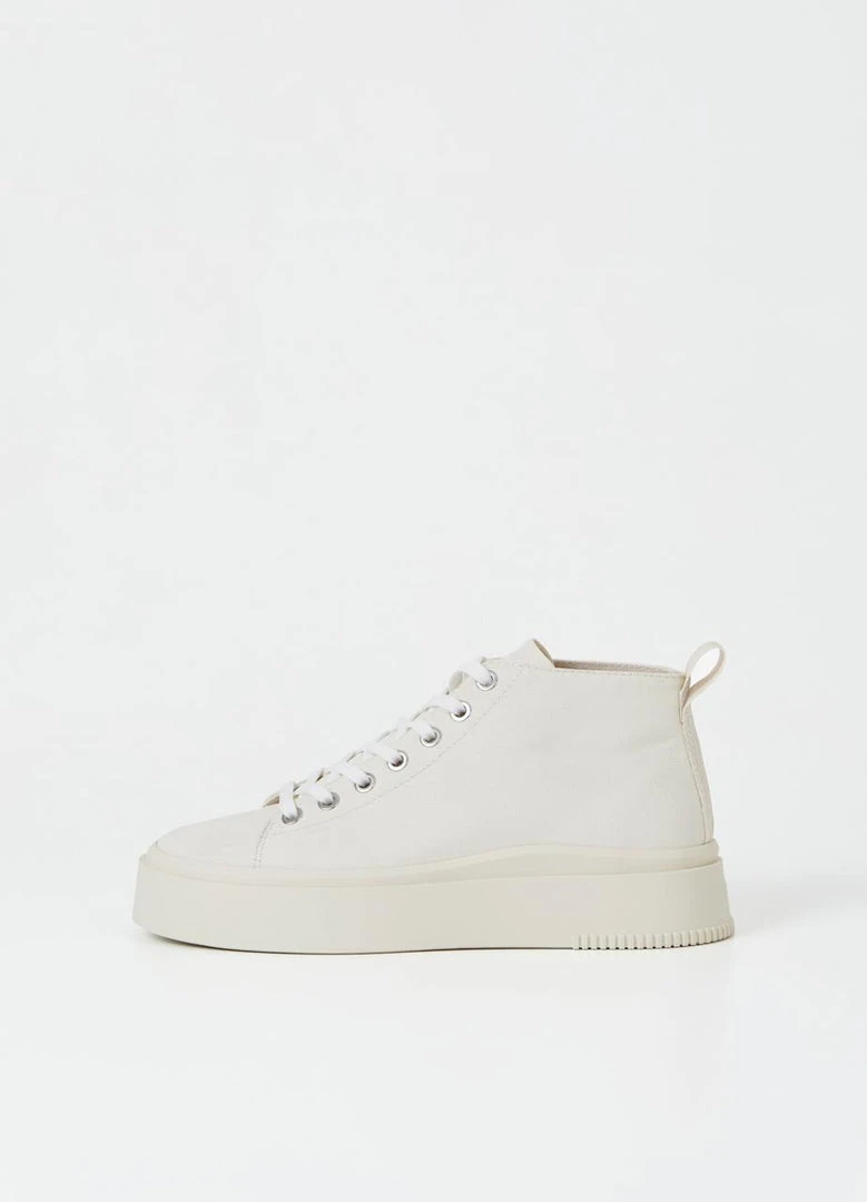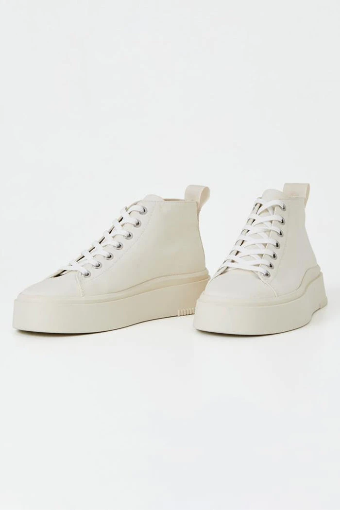Vagabond Stacy high-top flatform sneakers with a contemporary silhouette in cream. Crafted in cream white textile featuring lace-up fastening, rounded toes and pull-on tabs.