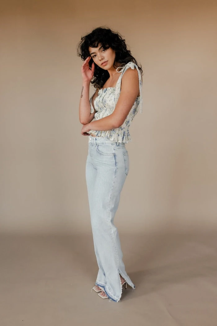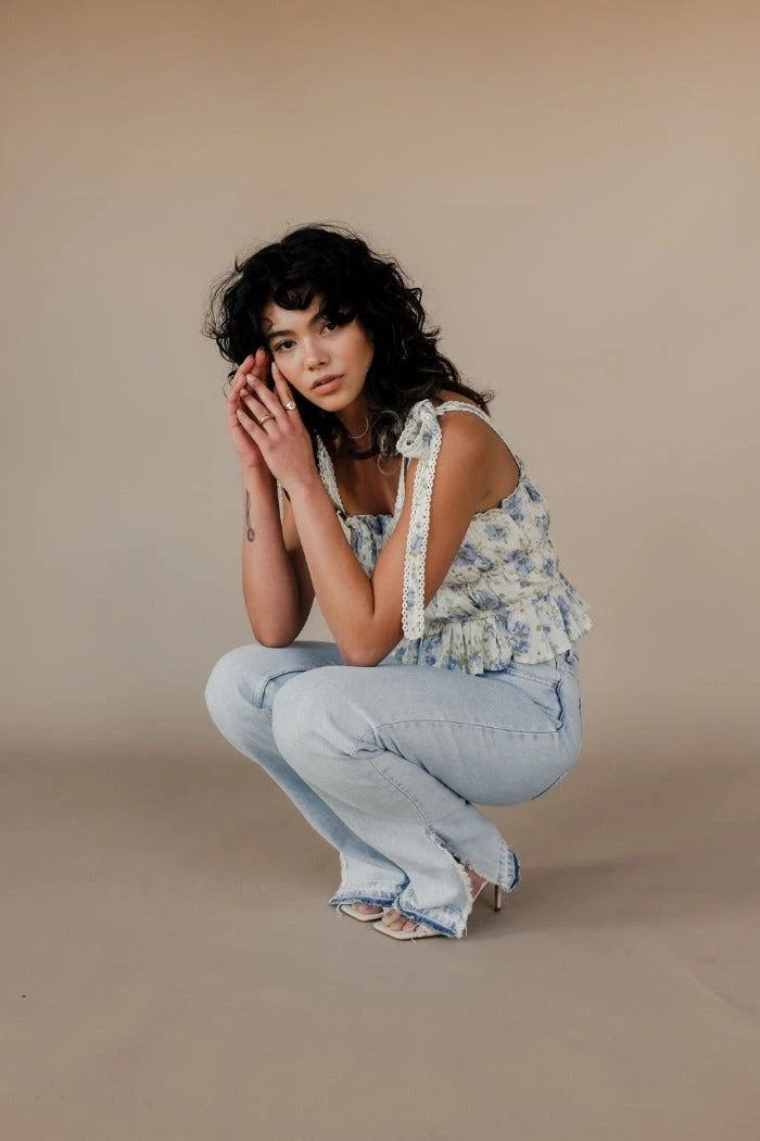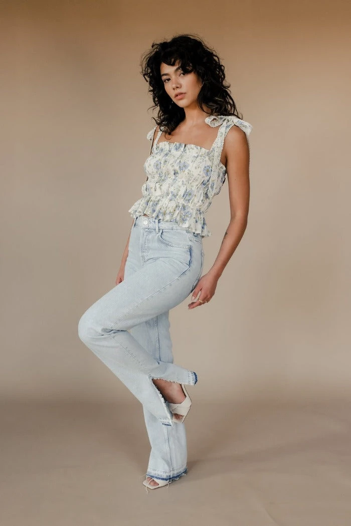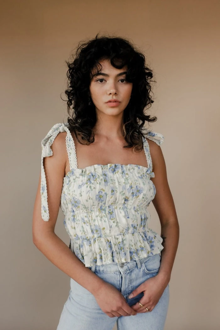 Winston White Marjorie Top in floral Pewter Petal. Features a custom print, intricate lace trim on tie straps, elastic under bust and at waist with a ruffle edge.