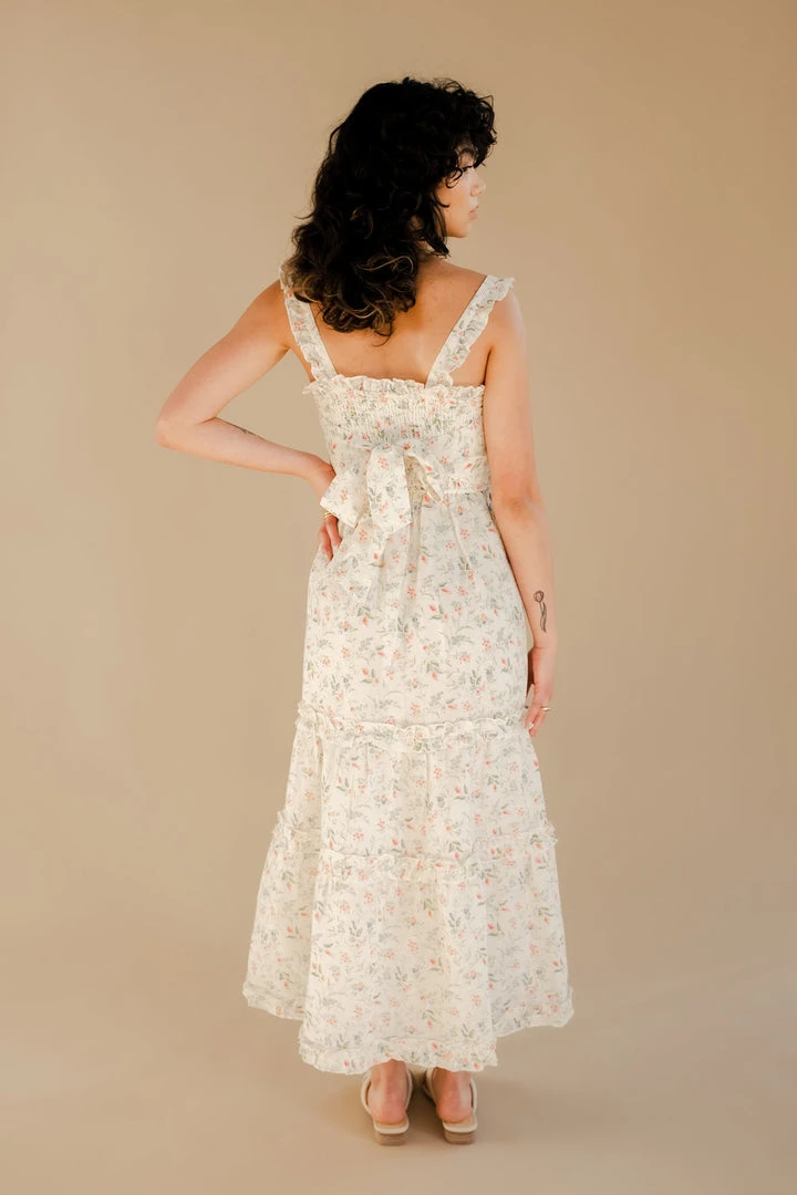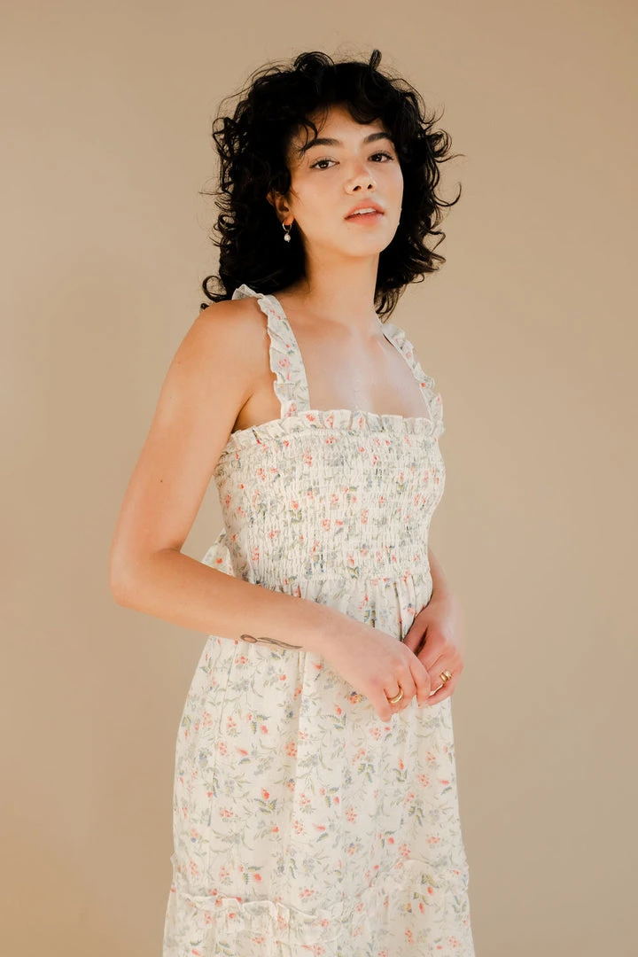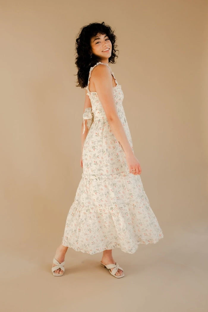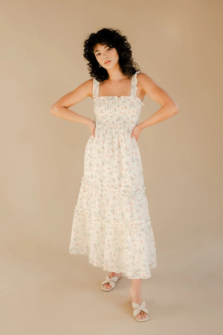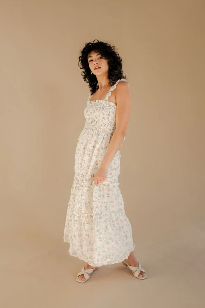 Winston White smocked long Tahoe dress in coral fleur print. Custom floral print. Features ruffle straps, smocked chest, tie back at waist, and ruffle details on ankle length skirt.