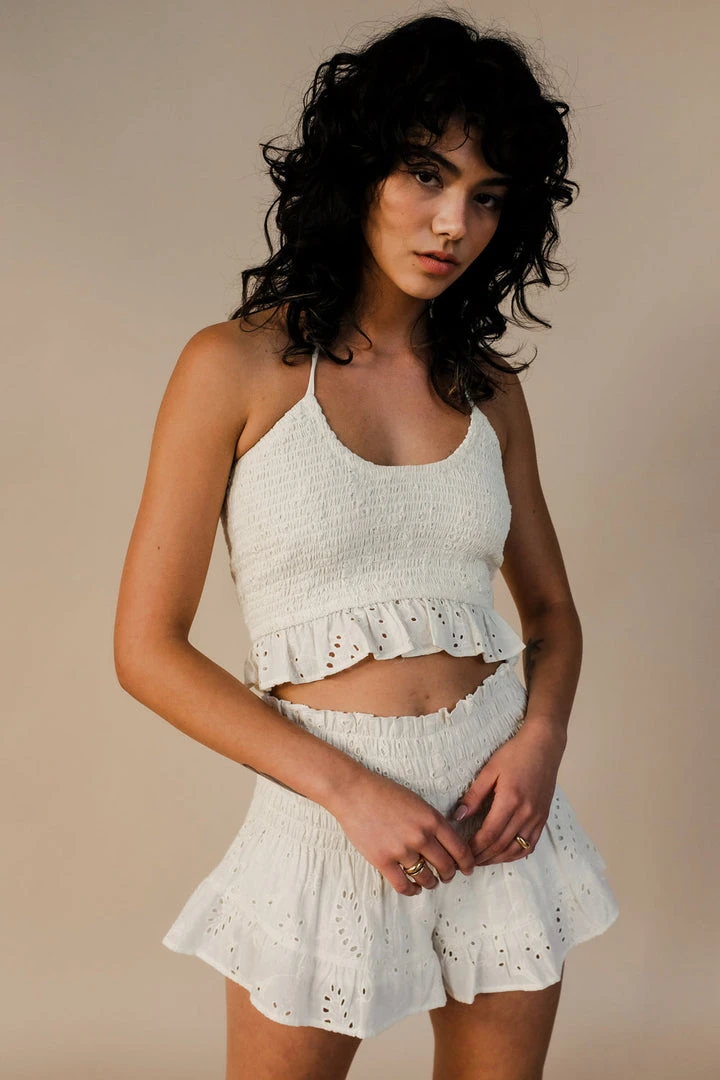 Winston White smocked Topanga halter top in Pearl ivory. Custom eyelet top features a smocked U neck with a halter tie and ruffle hem.