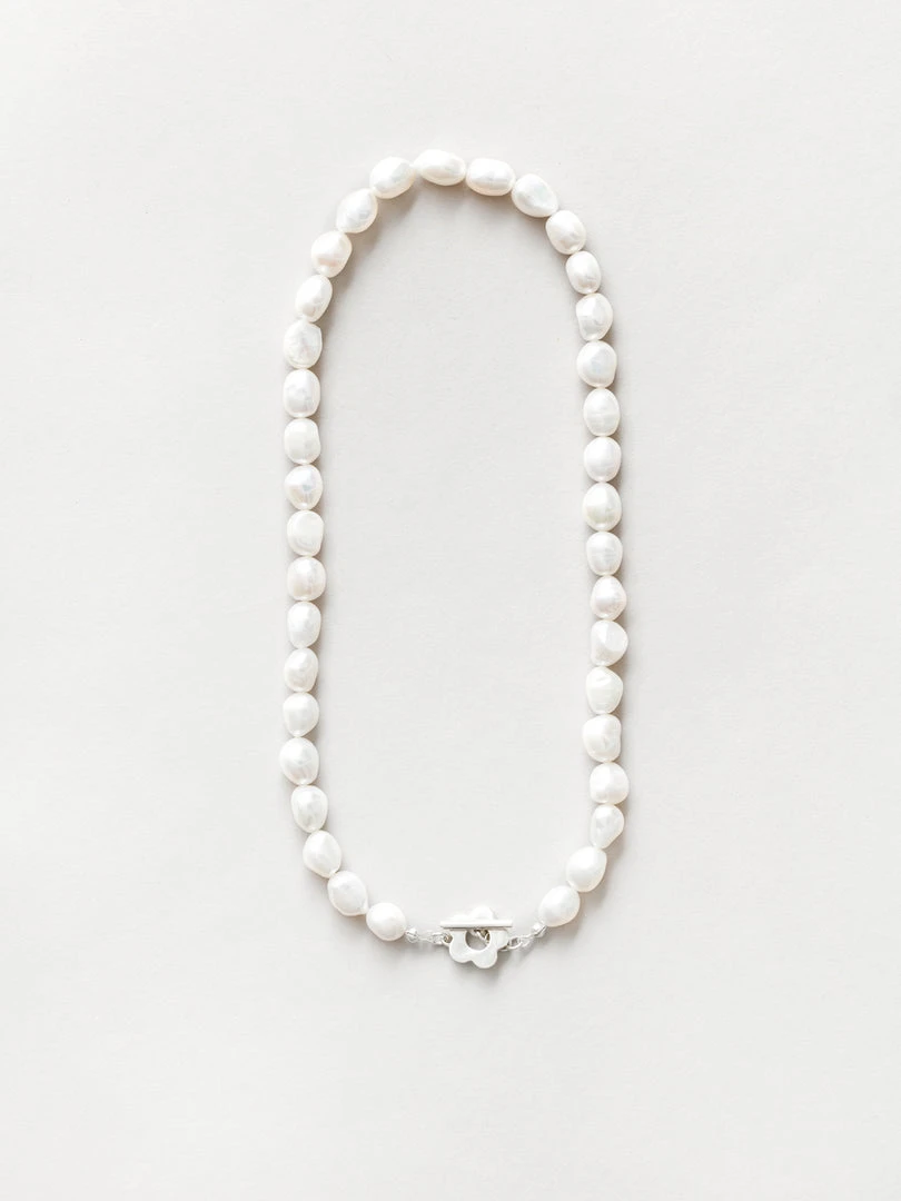 16.5” Freshwater pearl necklace. Sterling silver toggle. Toggle made with recycled silver.