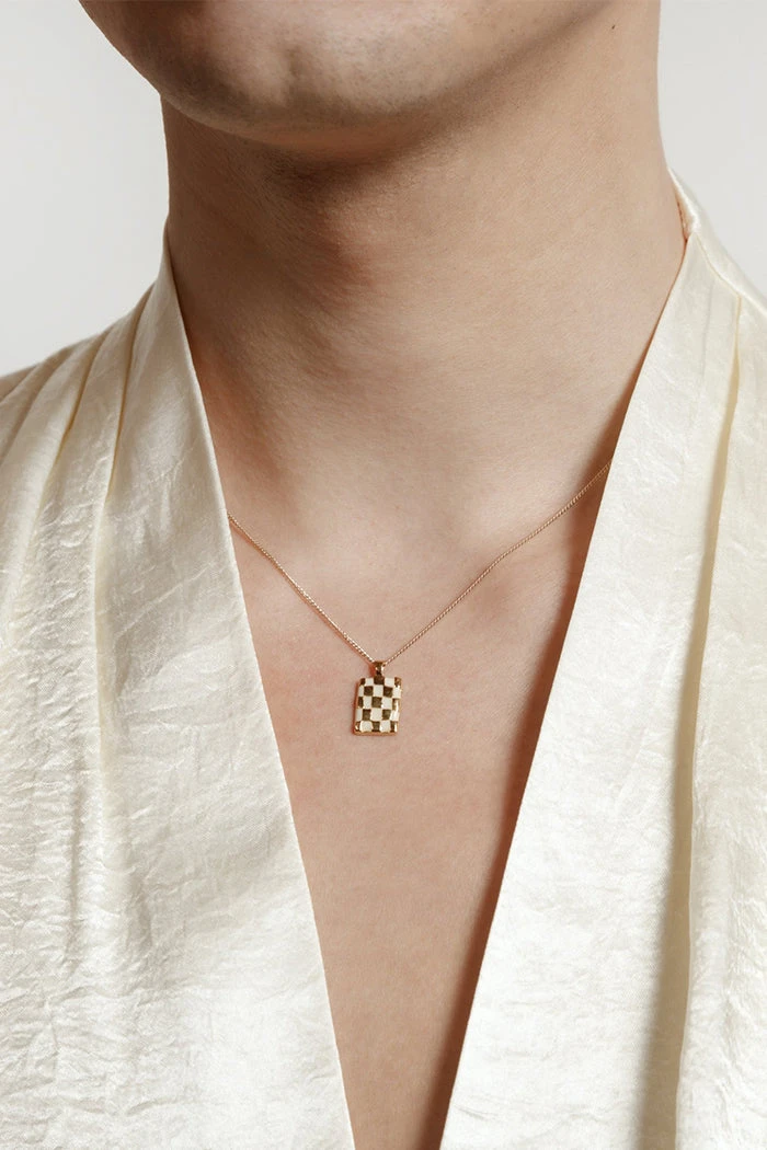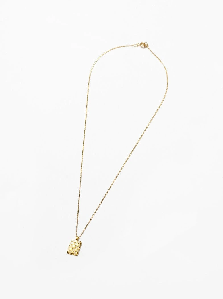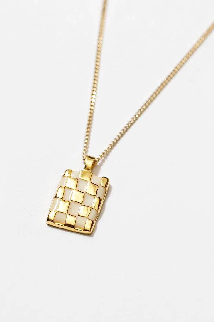 Wolf Circus Penny rectangular checkered pendant necklace with cream and gold checkered pattern.