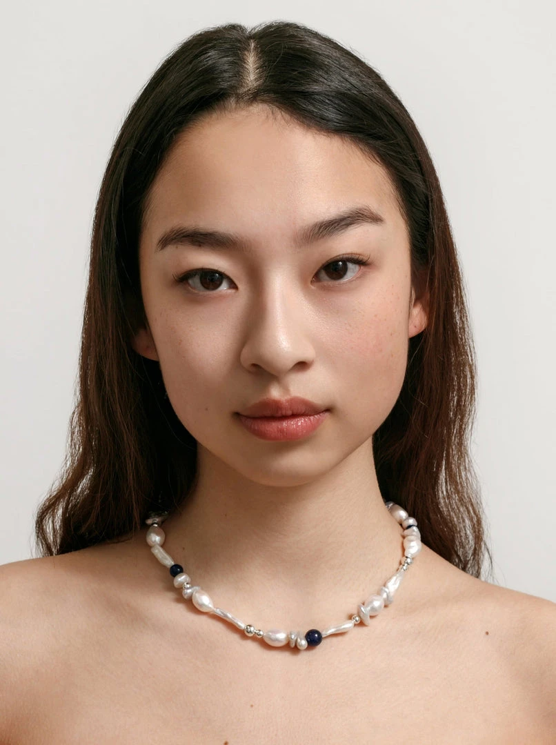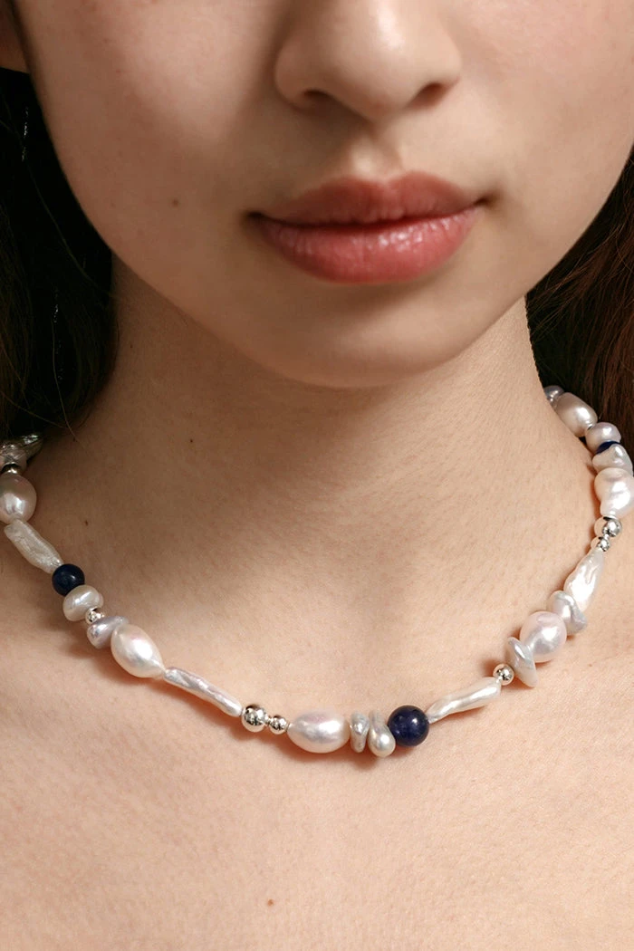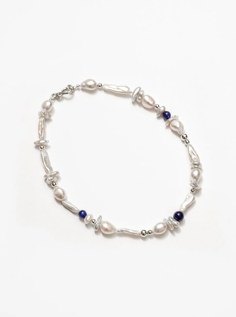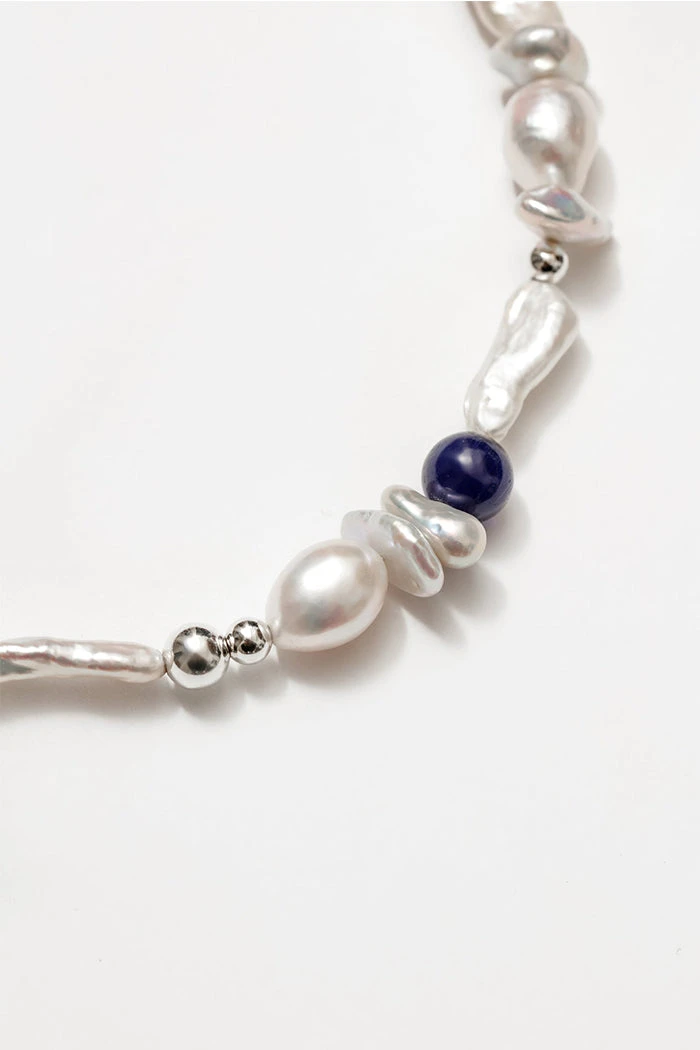 18″ white pearls in different shapes and sizes. Interspersed blue cat eye and 925 sterling silver beads. Handmade 925 sterling silver hook closure.